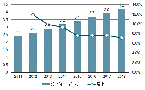 2012-2018年中國建筑裝飾行業產值及增速趨勢